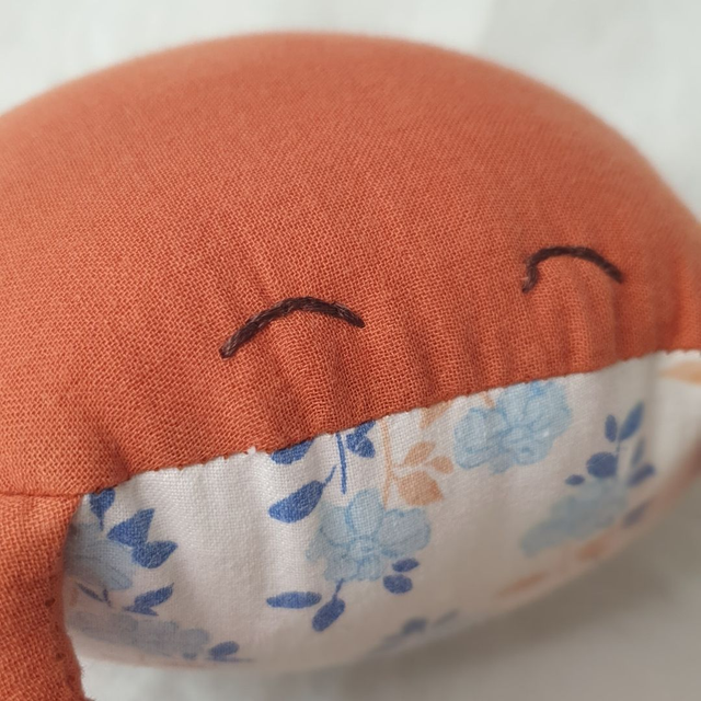 Cette Jolie Gueille est confectionnée en tissu upcyclé, une double gaze de coton couleur brique et un coton provenant de chutes de tissus d'un atelier de couture.