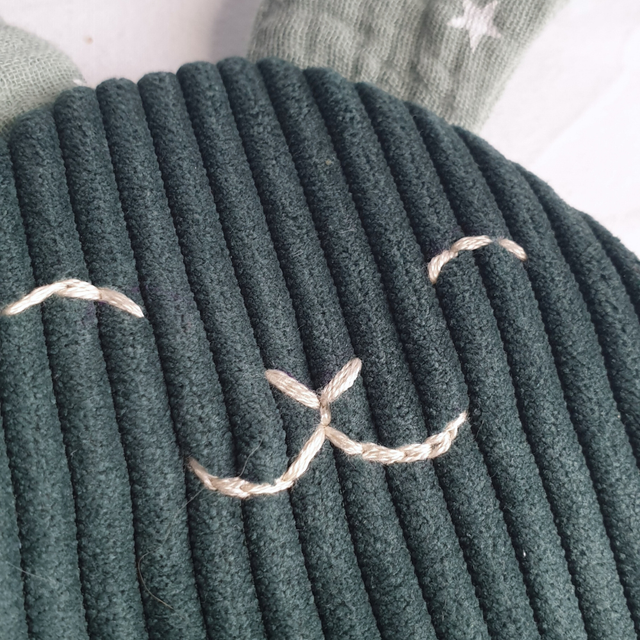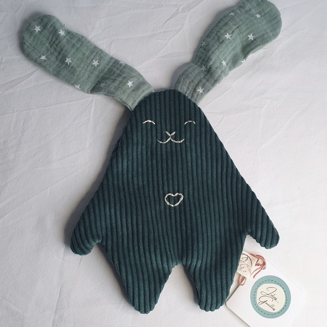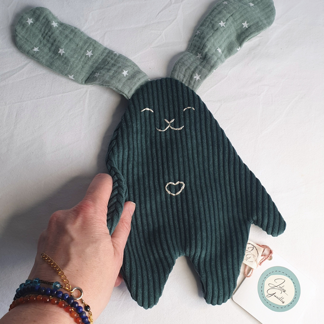 Fabriqué à la main avec amour, ce doudou est composé de velours côtelé vert, et de double gaze de coton, provenant de chutes d'atelier de couture. Il est très doux sous les doigts de bébé, et la texture côtelée stimulera sa curiosité !