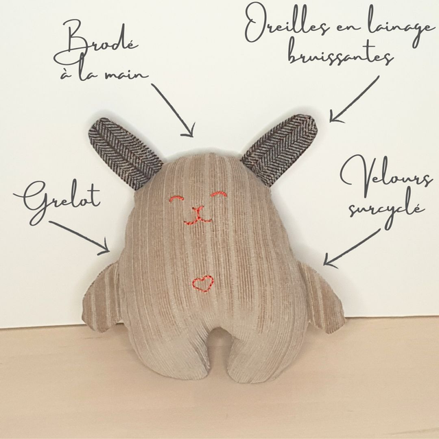 Découvrez Germain le Lapin, un adorable doudou confectionné avec amour et soin, destiné à apporter réconfort et douceur à vos tout-petits. Chaque exemplaire est unique, créé de manière artisanale à partir de velours côtelé issu de chutes de tissus surcyclés, contribuant ainsi à une approche éco-responsable.