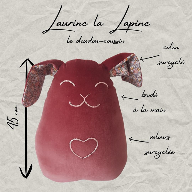 Ajoutez une touche de douceur et de charme à votre intérieur avec Laurine le Coussin Doudou Lapin, une pièce unique confectionnée avec soin à la main. Fabriqué à partir de tissus upcyclés, ce coussin incarne à la fois l'originalité et la durabilité, tout en contribuant à réduire notre empreinte écologique.