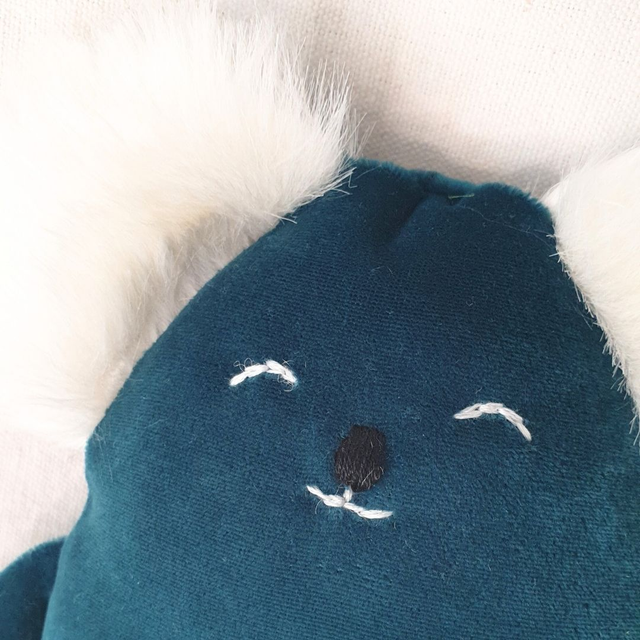 Noah le Koala est un adorable doudou confectionné à la main à partir de velours et de fausse fourrure, 100 % surcyclés, l'un provenant d'une chute de tissu défectueux et l'autre d'un manteau.