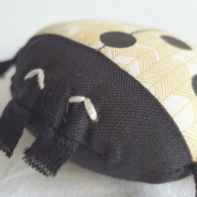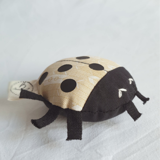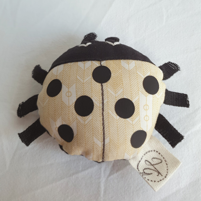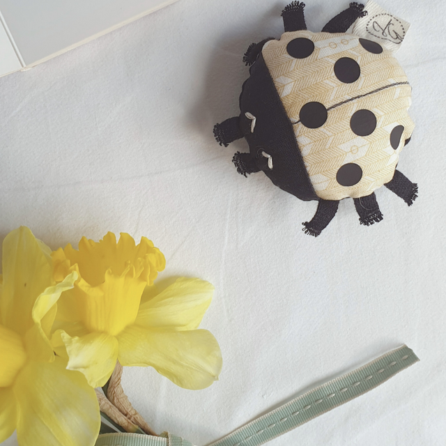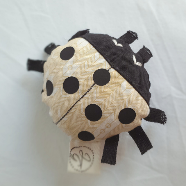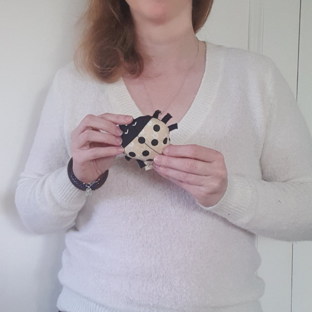 Cette petite coccinelle tient dans la main, un petit jouet à emmener partout, à accrocher à la poussette avec un ruban pour ne pas la perdre !