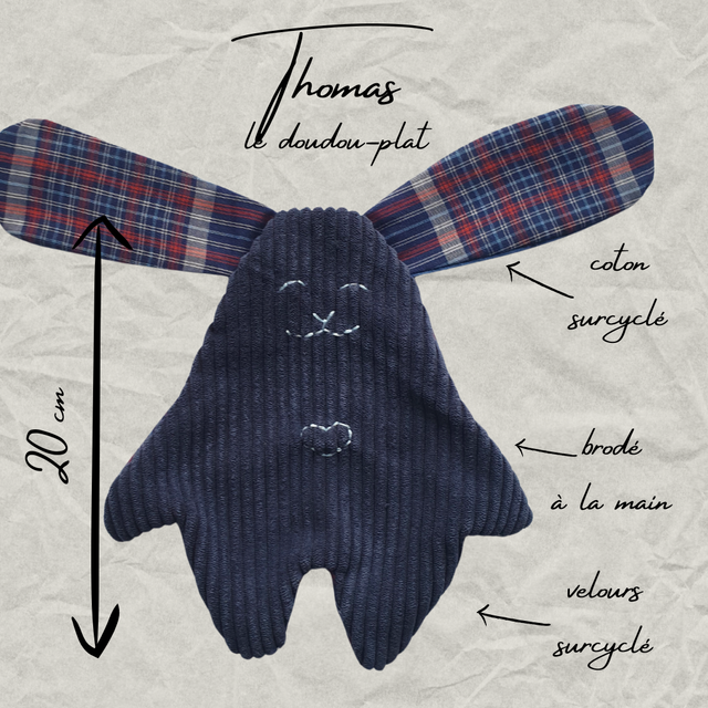 Offrez à votre bébé une douce compagnie avec Thomas, notre doudou plat en forme de lapin, une création artisanale confectionnée à la main avec amour et soin. Thomas est une pièce unique.