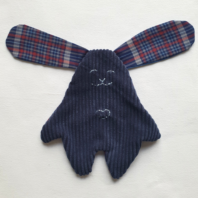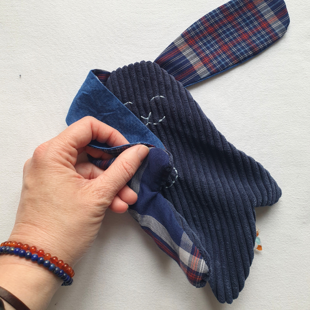 Thomas est façonné à partir de tissus upcyclés, soulignant notre engagement envers la durabilité et la créativité. Le velours côtelé bleu marine offre une texture douce et réconfortante, tandis que le coton de chemise bleu à carreaux ajoute une touche de caractère ludique et rustique.